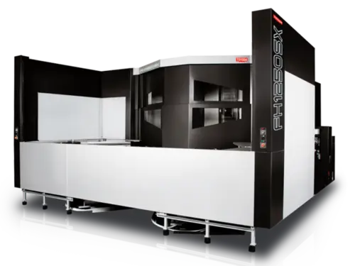 The FH1250SX is a powerful, high-speed horizontal machining center featuring a 6,000 RPM spindle, with options of an 8,000 RPM or 15,000 RPM high-torque spindle, and a rapid feedrate of 1,654 ipm (42 m/min). This machine has cylindrical roller guides for increased speed, and dual ballscrew drive on the Y and Z axes and a Meehanite cast iron base for maximum rigidity.