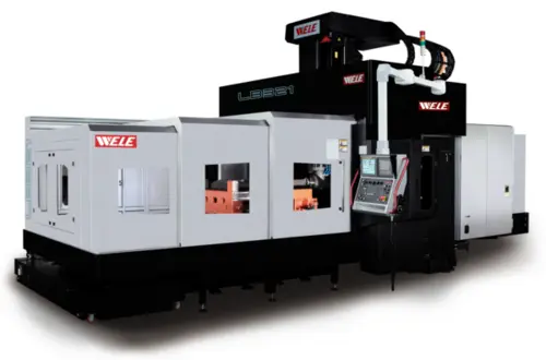 The LB525 is a double column, fixed rail bridge machine designed for heavy cutting applications. It features a robust geared-head spindle, a hydraulic counterbalance system on the headstock, and a Meehanite cast iron base. These features allow the machine to excel in the heaviest of cuts.