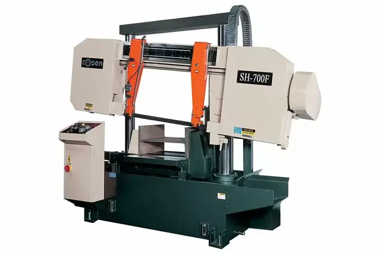 Semi-Automatic Canted Frame Straight Cutting Saws, these straight cutting band saws adopt the canted frame design available from 0° to 7.5° or 10°, which is particularly useful when cutting structural material giving you better cutting efficiency and blade life. The dual column, cross link and saw frame hydraulic cylinders as a group form a very rigid structure maximizing your productivity particularly in pack cutting.