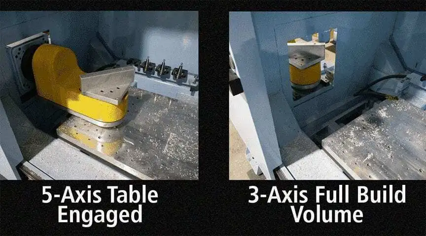 • Table assembly is mounted on precision linear rails. It can be moved into position in seconds. When 5 axis capability is not needed, it can be easily positioned outside of the 3 axis build area and the full 3 axis build area is maintained.